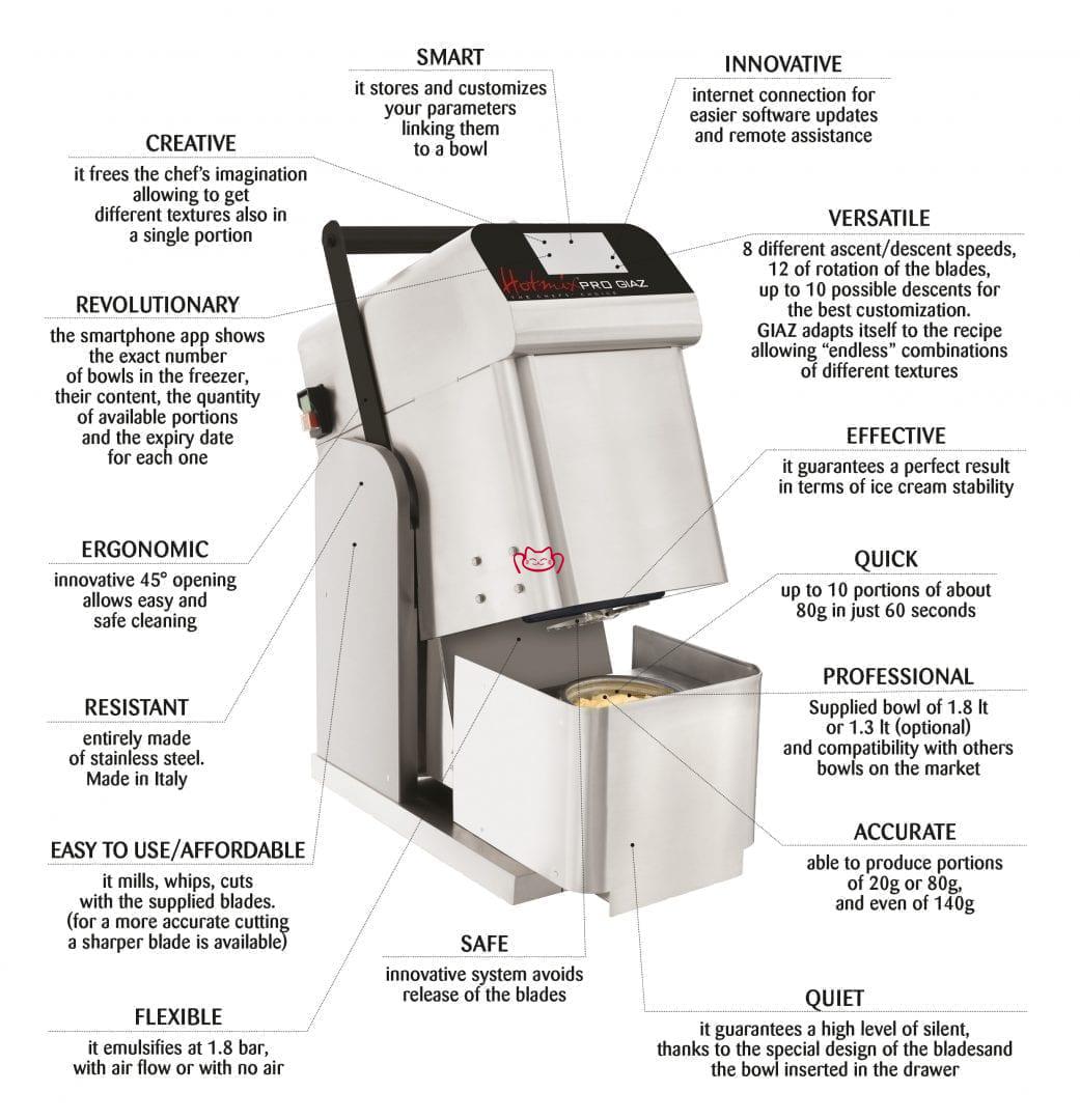特征: HotmixPRO Giaz 是 HotmixPRO 系列專業(yè)廚房工具帶給您的最新革命,它徹底革新了現(xiàn)有技術(shù)——將冷凍產(chǎn)品還原成泥——這要?dú)w功于許多創(chuàng)新和直觀的技術(shù)解決方案。它可以優(yōu)化任何廚房的效率,允許儲(chǔ)存任何類型的冷凍制劑,并在以后對(duì)其進(jìn)行刮除/乳化。它是即時(shí)制備冰淇淋和冰糕以及奶油和乳液的理想選擇,它是一個(gè)完美的管理和組織系統(tǒng),適用于所有適合冷凍和存放在冷藏庫(kù)中的食譜。