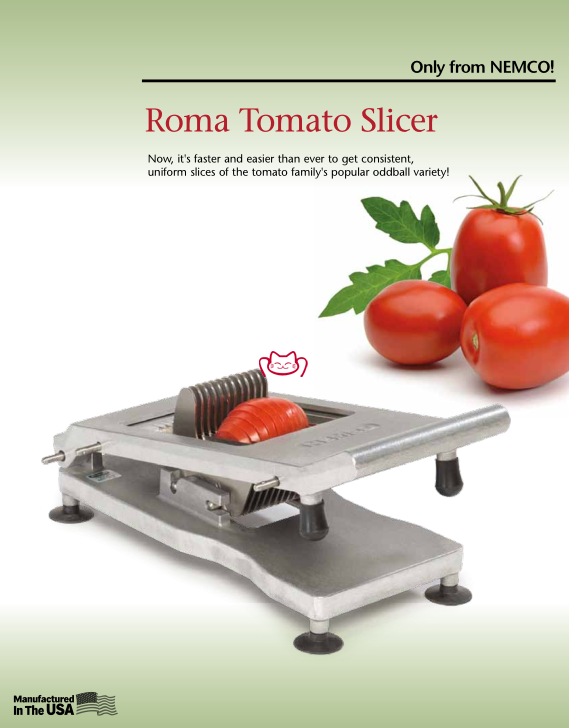 特征:Roma Tomato Slicer, 3/16" slice, razor-sharp blades, pretensions scalloped blade assembly, cast aluminum frame, suction-cup feet, NSF
