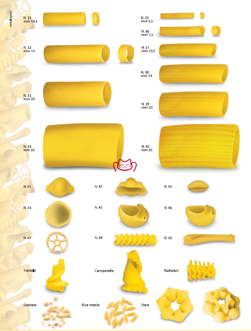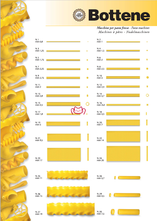 支持多種面粉類型(如軟小麥、杜倫小麥、全麥等)及不同配方(含蛋或不含蛋),可制作多種面食形狀,包括但不限于: