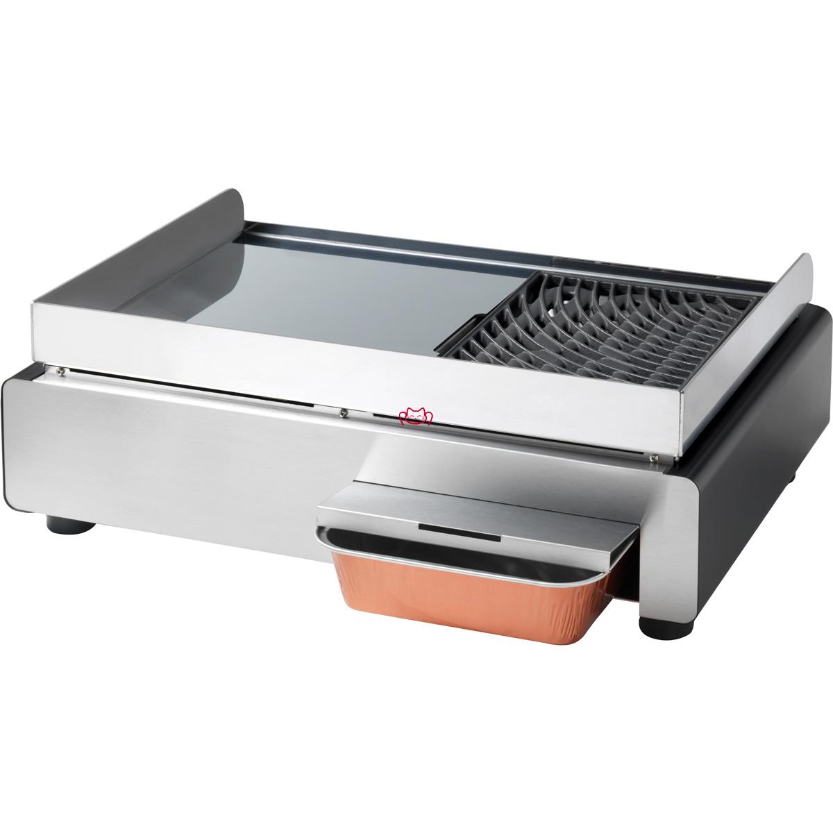 特征: Duo K 在一個(gè)設(shè)備上結(jié)合了真正的普蘭查和電動(dòng)燒烤。這款二合一手機(jī)提供兩個(gè)獨(dú)立的烹飪區(qū):功率為 1800 W 的不銹鋼板上的 plancha 烹飪區(qū)和功率為 1700 W 的搪瓷穿孔鑄鐵板上的燒烤烹飪區(qū)。Duo K 非常易于使用,可讓您在同一設(shè)備上準(zhǔn)備所有食譜。 兩個(gè)恒溫器??可輕??松調(diào)節(jié)至 300°C,并允許加熱溫度適應(yīng)不同的熟食。烹飪殘?jiān)占P位于燒烤架下方,用于收集兩個(gè)烹飪空間的汁液。