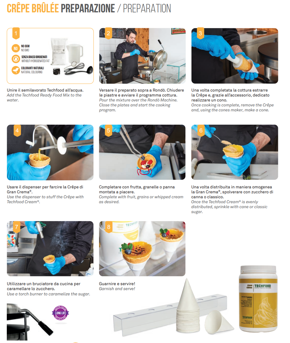 特征: 如何豐富世界上消費(fèi)最多的產(chǎn)品之一? 如何打造一款既時(shí)髦又外帶的街頭美食風(fēng)格甜品? 這些問題的答案只能是:Crêpe Brûlée!得益于 Techfood 生產(chǎn)的設(shè)備和即食食品組合,這種令人驚嘆的甜味小吃很容易準(zhǔn)備,只需幾秒鐘即可準(zhǔn)備和烹制香味可麗餅。 提供的附件完成了工作,在準(zhǔn)備和提供階段幫助操作員。 火炬燃燒器可以使灑在填充有 Techfood Cream® 的可麗餅頂部的糖焦糖化,從而使產(chǎn)品具有松脆的成分。 實(shí)用的展示旨在鼓勵(lì)沖動(dòng)購買并激活 WOW 效果。將 Techfood Ready Food Mix 添加到水中。 將混合物倒在回旋曲機(jī)上。 關(guān)閉盤子并啟動(dòng)烹飪程序。 烹飪完成后,取出可麗餅,然后,使用錐體制造器,制作一個(gè)錐體。 使用分配器將 Techfood Cream® 填充到可麗餅中。根據(jù)需要搭配水果、谷物或生奶油。 均勻分布 Techfood Cream® 后,撒上甘蔗糖或經(jīng)典糖。 使用火炬燃燒器使糖焦糖化。 裝飾和服務(wù)!