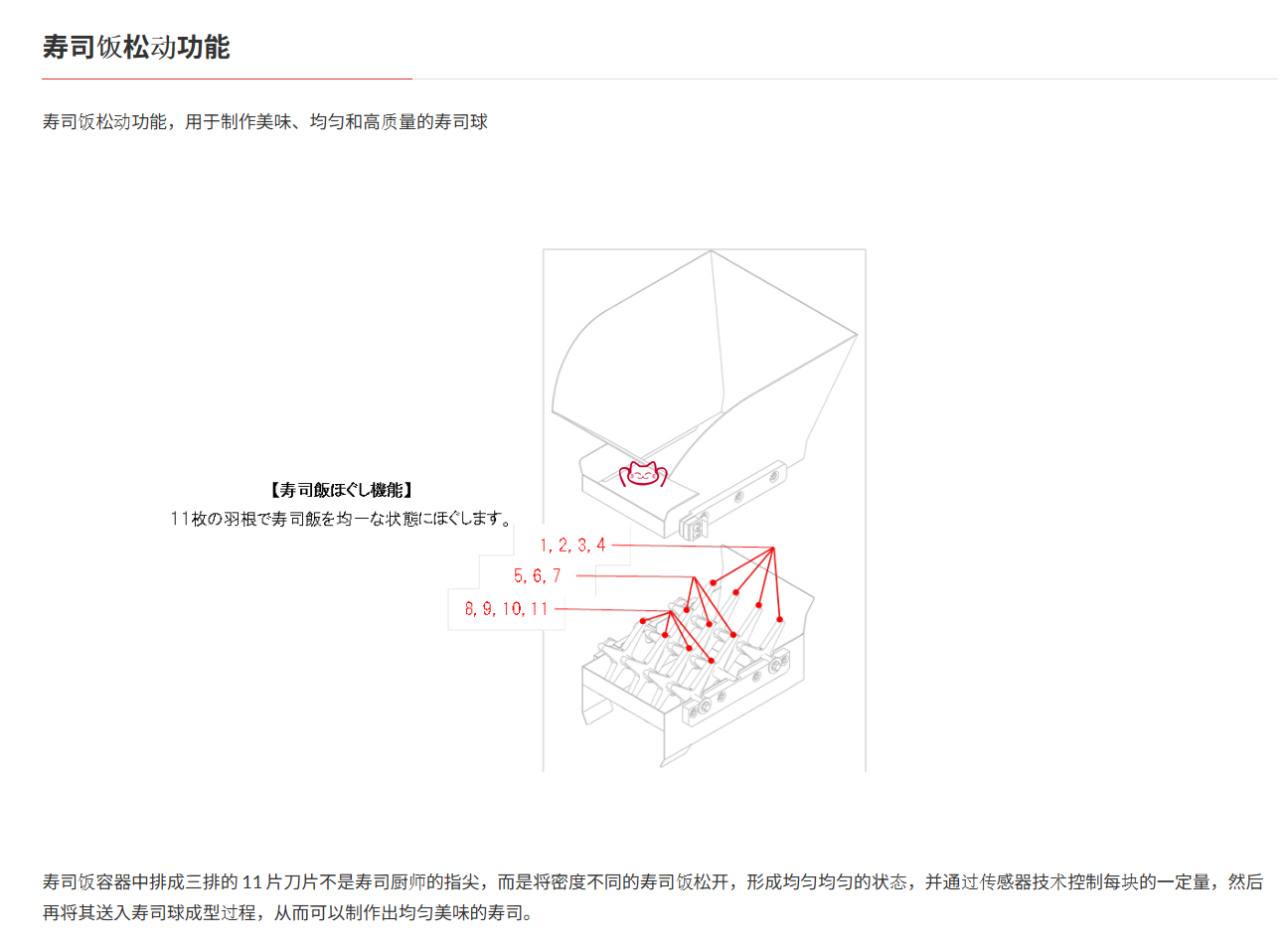 -壽司飯松動(dòng)功能,用于制作美味、均勻和高質(zhì)量的壽司球,壽司飯容器中排成三排的 11 個(gè)刀片代替了壽司廚師的指尖,將密度不同的壽司飯松開(kāi),使其均勻均勻,并通過(guò)傳感器技術(shù)控制每塊的一定量,然后再將其送入壽司球成型過(guò)程,從而可以生產(chǎn)出均勻美味的壽司。