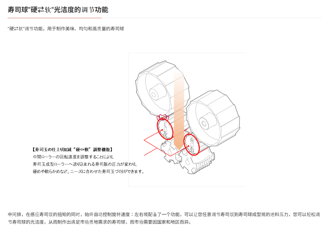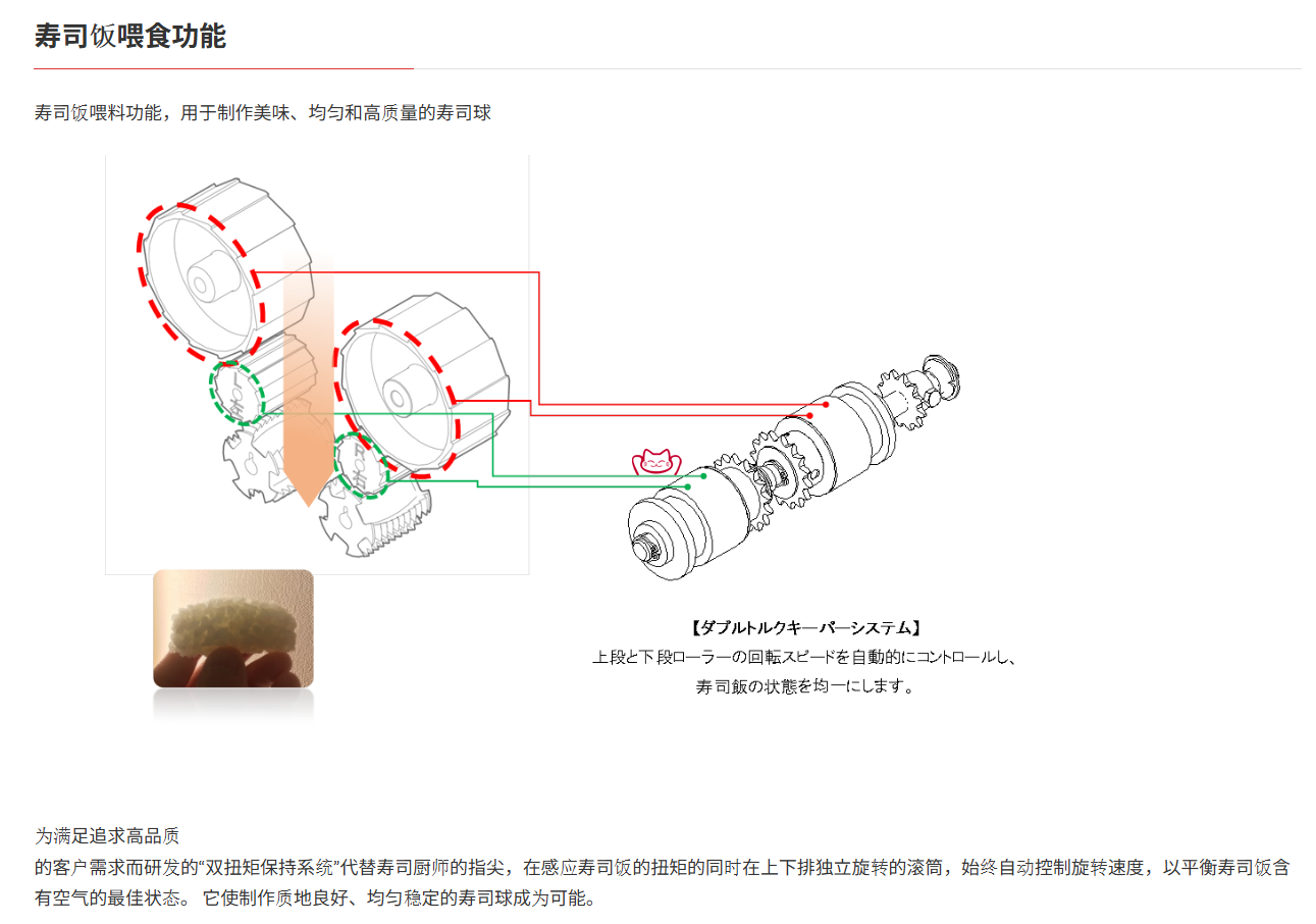 -壽司飯喂料功能,用于制作美味、均勻和高質(zhì)量的壽司球,為滿足追求高品質(zhì)的客戶需求而研發(fā)的“雙扭矩保持系統(tǒng)”代替壽司廚師的指尖,在感應(yīng)壽司飯的扭矩的同時(shí)在上下排獨(dú)立旋轉(zhuǎn)的滾筒,始終自動(dòng)控制旋轉(zhuǎn)速度,以平衡壽司飯含有空氣的最佳狀態(tài)。 它使制作質(zhì)地良好、均勻穩(wěn)定的壽司球成為可能。
