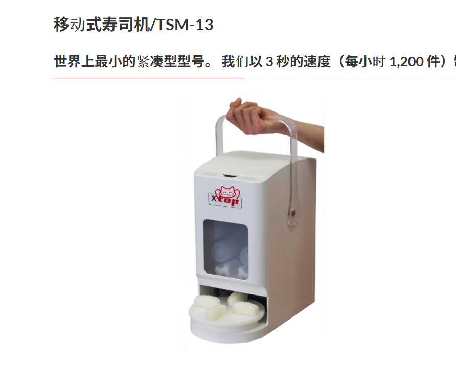 -移動式壽司機/TSM-13,世界上最小的緊湊型型號。 我們以 3 秒的速度(每小時 1,200 件)制作壽司球。