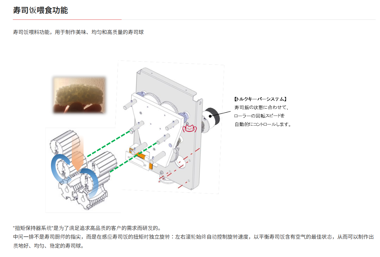 -壽司飯喂料功能,用于制作美味、均勻和高質(zhì)量的壽司球: “扭矩保持器系統(tǒng)”是為了滿足追求高品質(zhì)的客戶的需求而研發(fā)的。中間一排不是壽司廚師的指尖,而是在感應(yīng)壽司飯的扭矩時獨立旋轉(zhuǎn):左右滾輪始終自動控制旋轉(zhuǎn)速度,以平衡壽司飯含有空氣的最佳狀態(tài),從而可以制作出質(zhì)地好、均勻、穩(wěn)定的壽司球。