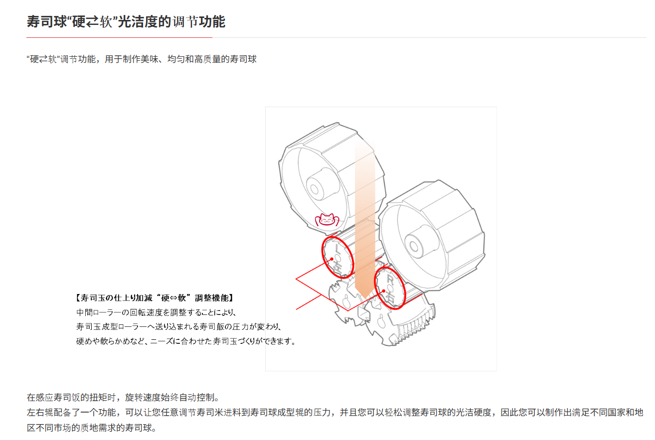 -壽司球“硬?軟”光潔度的調(diào)節(jié)功能,用于制作美味、均勻和高質(zhì)量的壽司球. 在感應(yīng)壽司飯的扭矩時,旋轉(zhuǎn)速度始終自動控制。左右輥配備了一個功能,可以讓您任意調(diào)節(jié)壽司米進(jìn)料到壽司球成型輥的壓力,并且您可以輕松調(diào)整壽司球的光潔硬度,因此您可以制作出滿足不同國家和地區(qū)不同市場的質(zhì)地需求的壽司球。