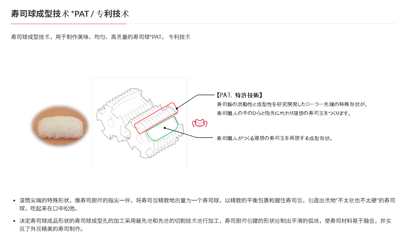 -壽司球成型技術(shù),用于制作美味、均勻、高質(zhì)量的壽司球。滾筒尖端的特殊形狀,像壽司廚師的指尖一樣,將壽司飯精致地測量為一個壽司球,以精致的平衡包裹和握住壽司飯,創(chuàng)造出質(zhì)地“不太軟也不太硬”的壽司球,吃起來在口中松弛。決定壽司球成品形狀的壽司球成型孔的加工采用最先進(jìn)和先進(jìn)的切割技術(shù)進(jìn)行加工,壽司廚師創(chuàng)建的形狀繪制出平滑的弧線,使壽司材料易于融合,并實現(xiàn)了外觀精美的壽司制作。
