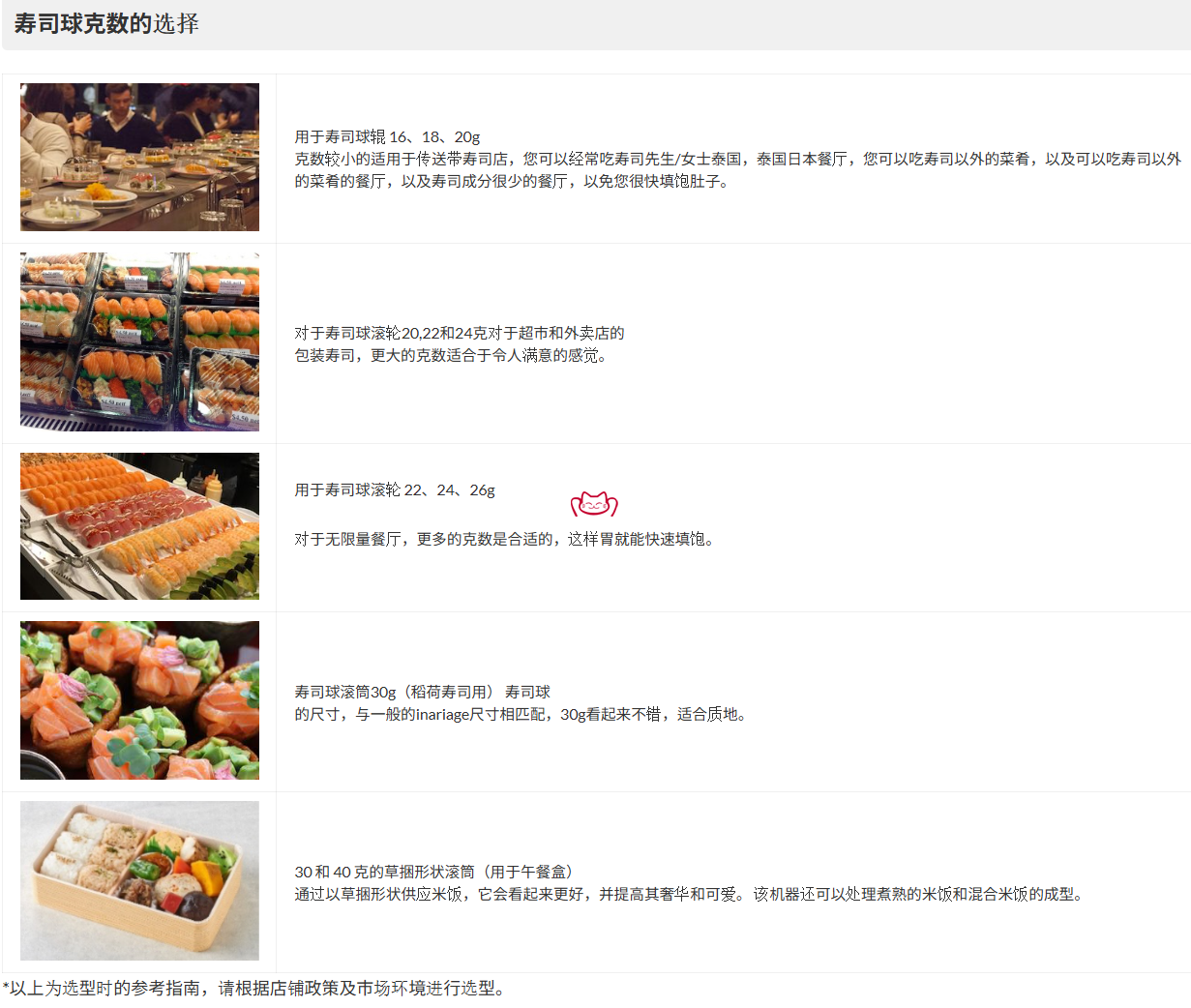 (2)用于壽司球滾輪 20、22、24g:對于超市和外賣店的包裝壽司,更大的克數(shù)適合獲得令人滿意的感覺。