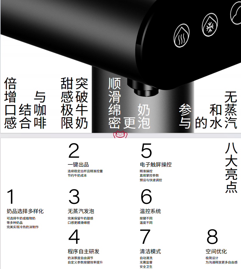 特征:無蒸汽和水的參與,奶泡更順滑綿密,突破牛奶甜感極限,跟咖啡結(jié)合倍增口感。