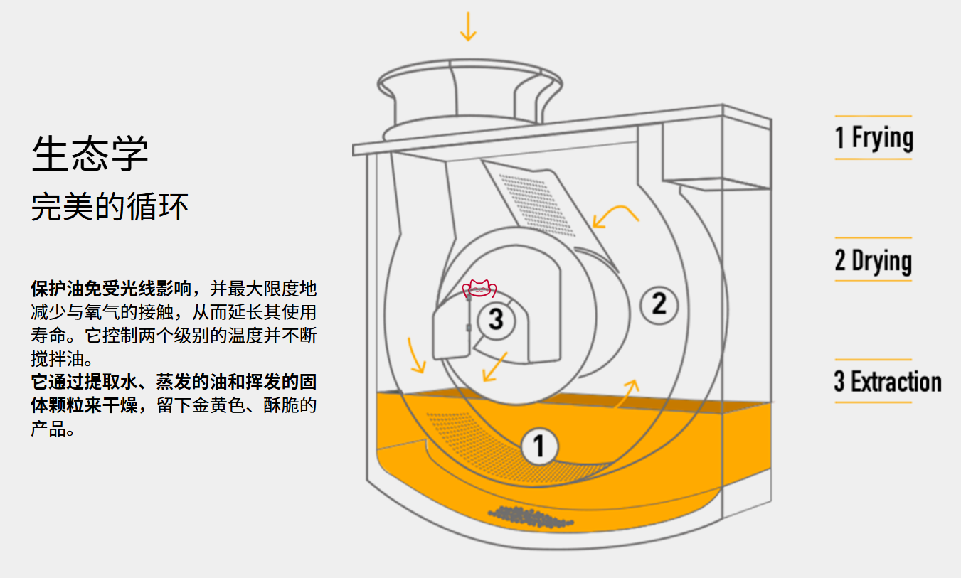 其核心技術(shù)是封閉式垂直油炸模塊與ECOFRY系統(tǒng),在近乎無(wú)氧、無(wú)光環(huán)境下炸制食品,不僅保持油溫穩(wěn)定,出品品質(zhì)高,還能節(jié)能24%、節(jié)油37%。相比傳統(tǒng)炸爐,它真正意義上實(shí)現(xiàn)了節(jié)能減排、自動(dòng)出品、安全作業(yè)三者兼顧。