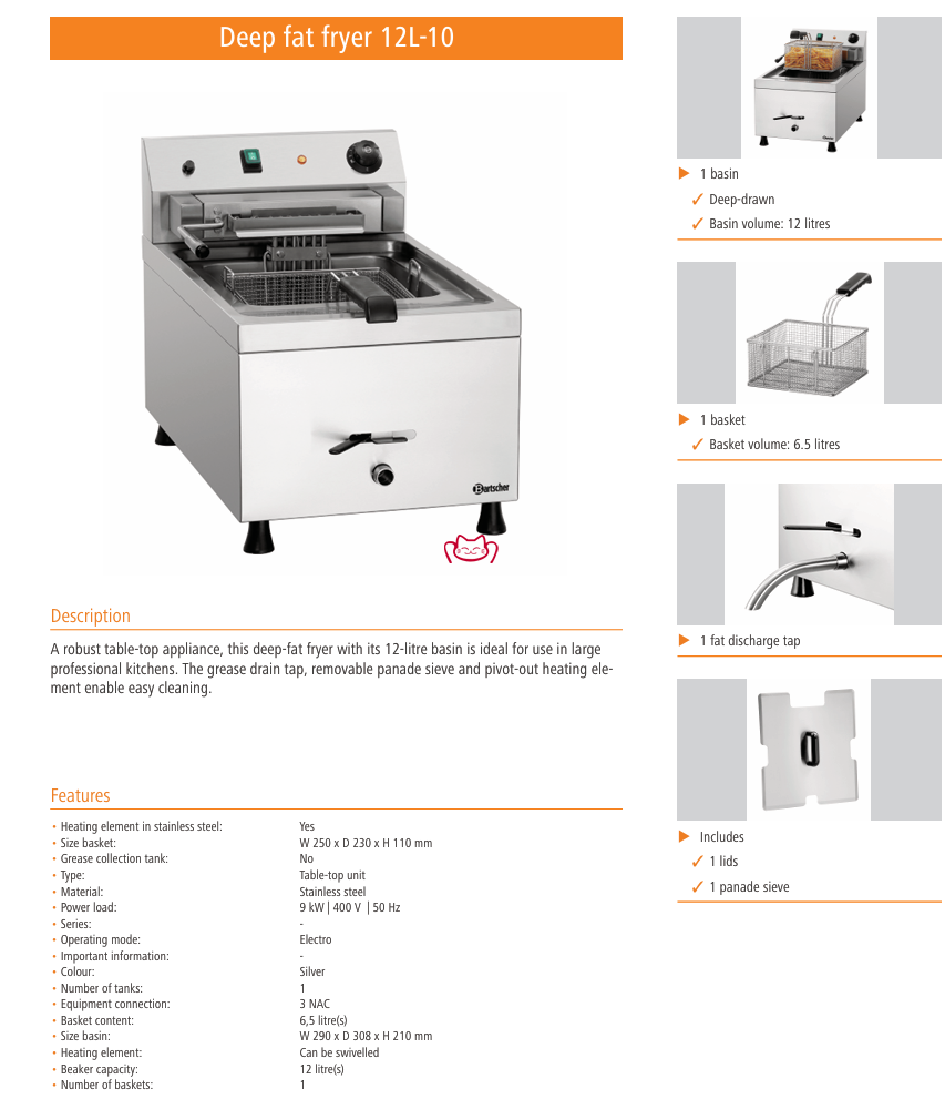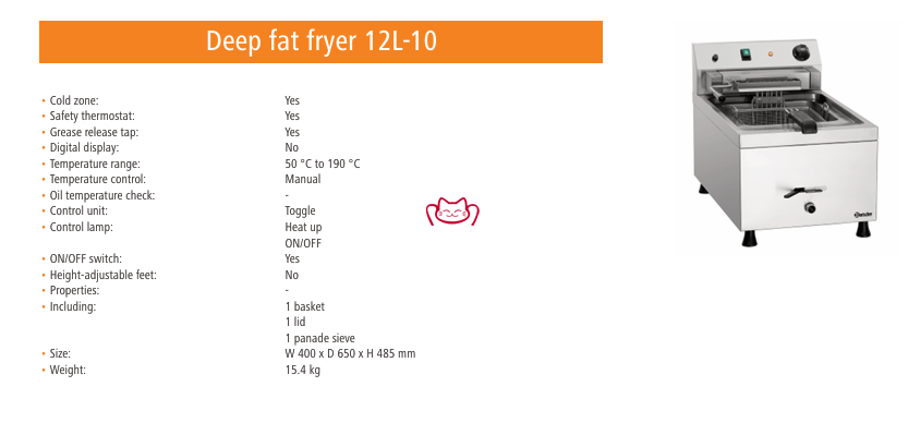 說明:Bartscher 162650 為臺面式單缸 12L 容量、供電 400V/9kW 的專業(yè)級電炸爐,體積適中但產(chǎn)能可滿足大批量出品。