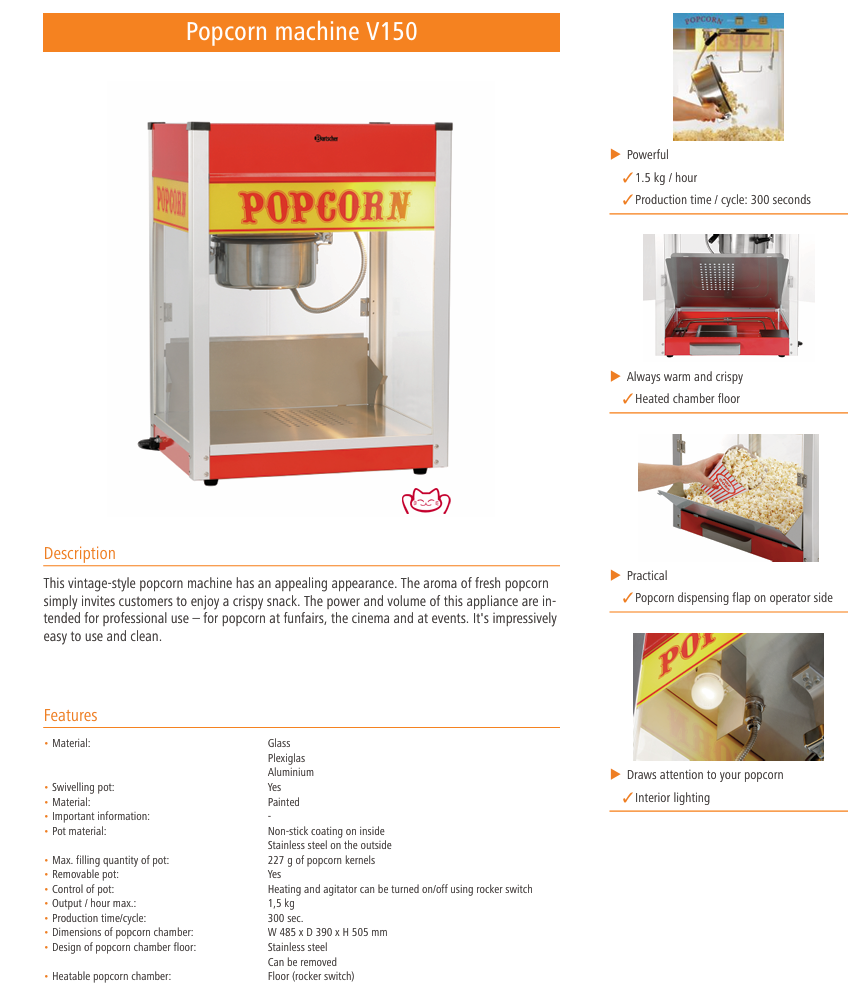 BARTSCHER 為德國品牌,V150 采用不粘內(nèi)鍋、外部不銹鋼與鋁合金涂裝,制造工藝更注重耐久與耐高溫運轉(zhuǎn)(專業(yè)設(shè)備設(shè)計),適合日常高頻爆米花出品,維護成本低。