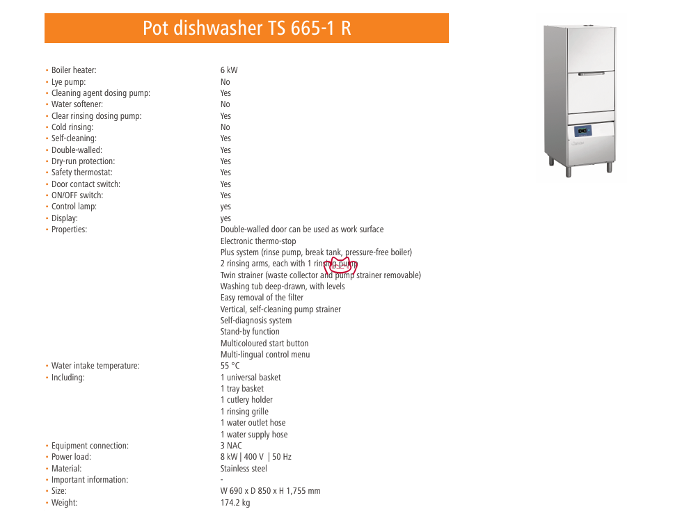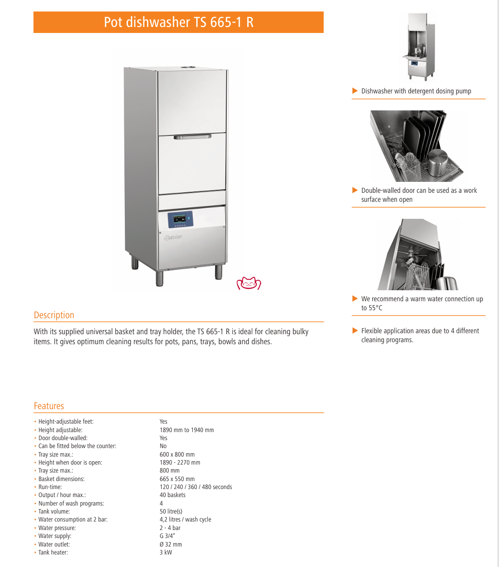 特征:配備通用籃框和托盤(pán)架的 TS 665-1 R,非常適合清洗體積較大的器具。可高效清洗鍋具、烤盤(pán)、托盤(pán)、碗碟等,確保理想的清潔效果。