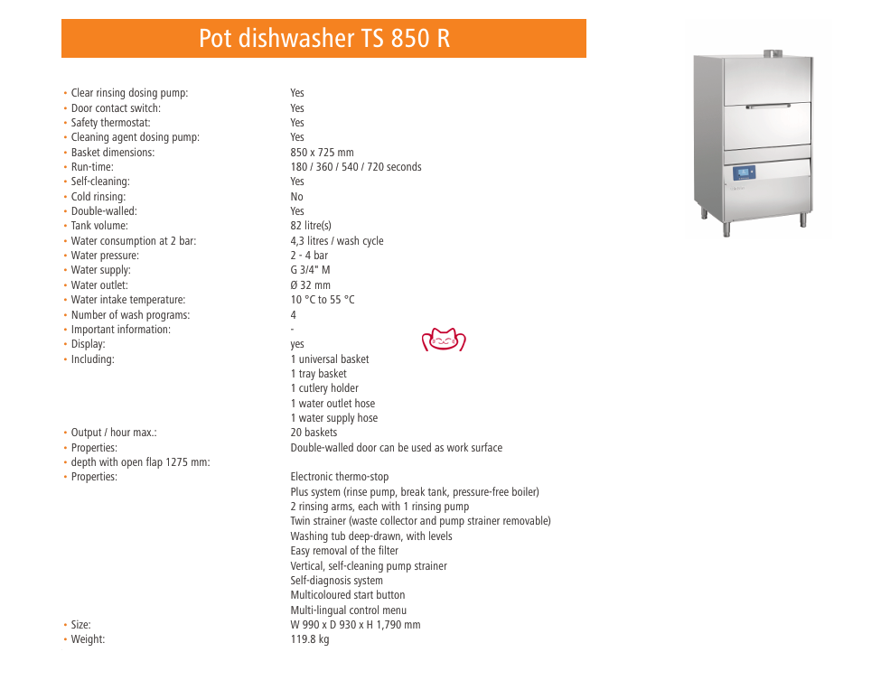 特征:TS 850 R 配備通用籃框和托盤架,非常適合清洗體積較大的器具。在清洗鍋具、烤盤、托盤、碗碟等物品時,能夠實現理想的清潔效果。