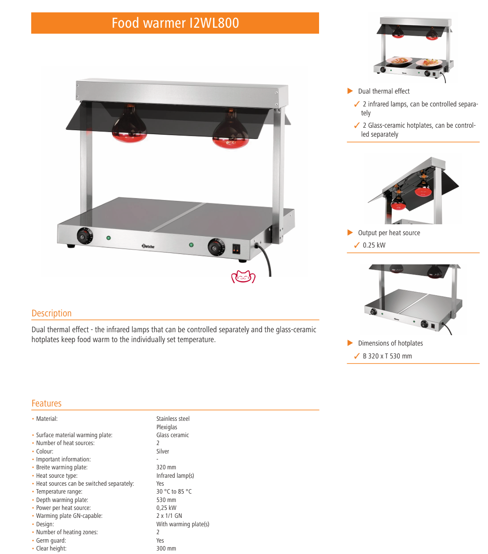 特征:雙重熱效應——可單獨控制的紅外線燈和玻璃陶瓷加熱板可將食物保溫至單獨設定的溫度。