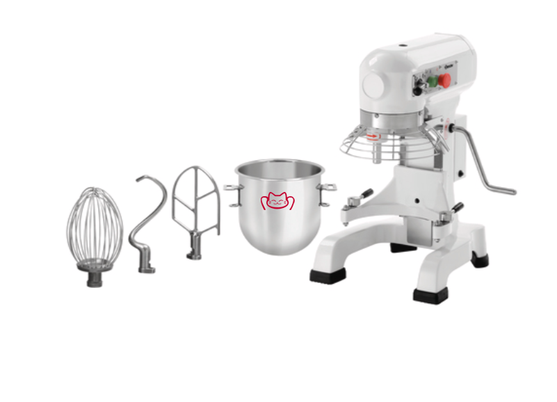 標配:平板攪拌器、不銹鋼面團鉤、攪拌槳(不銹鋼主體、鋁制連接)、不銹鋼防護格柵。一個機型即可完成攪拌、打發(fā)、揉面、醬料調(diào)制,多工序切換節(jié)省臺面和資本占用。
