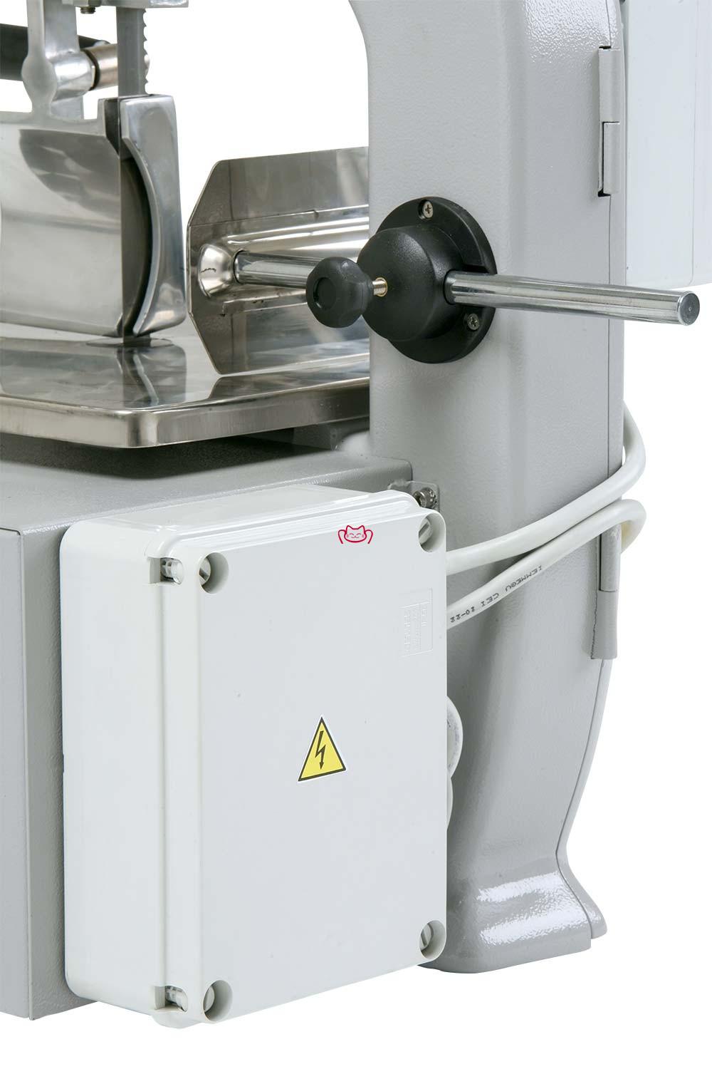 特征:200#電動(dòng)骨鋸 / 帶鋸機(jī)專用于切割冷凍肉類、骨頭和/或冷凍魚(yú)類。適用于肉鋪、酒店及團(tuán)餐廚房、餐廳等專業(yè)廚房環(huán)境。承載結(jié)構(gòu)堅(jiān)固,采用無(wú)加強(qiáng)筋的鑄鋁結(jié)構(gòu)。易于清潔,使用安全。大功率通風(fēng)電機(jī),支持連續(xù)運(yùn)行.安全裝置配有門蓋微動(dòng)開(kāi)關(guān)、24V 低壓電控系統(tǒng)、電機(jī)內(nèi)置機(jī)械安全制動(dòng)裝置.