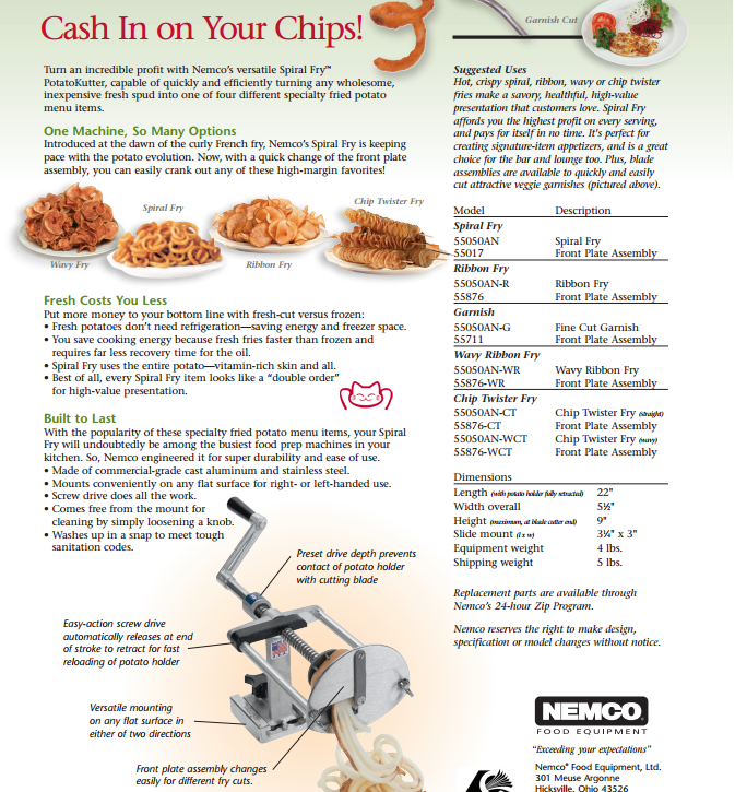 特征:這款多功能馬鈴薯螺旋切割機(jī)可隨時切割大量卷曲薯?xiàng)l! 與普通薯?xiàng)l相比,卷曲薯?xiàng)l的體積更大,鍍上后看起來像雙份訂單,幫助您減少份量,同時增加利潤! 這款 Nemco 刀具的商業(yè)級結(jié)構(gòu)可確保您的餐廳、小吃店或酒吧擁有較長的使用壽命!