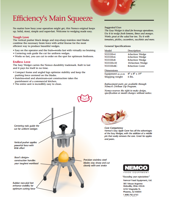 特征:It cuts and cores apples cleanly and precisely on the first try, maximizing your efficiency and helping you streamline your operation. This apple corer is great for salad bars, fruit plates, bakeries, and desserts and helps you save time and money.